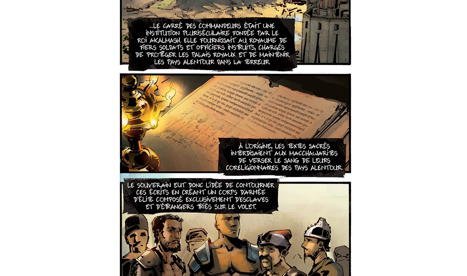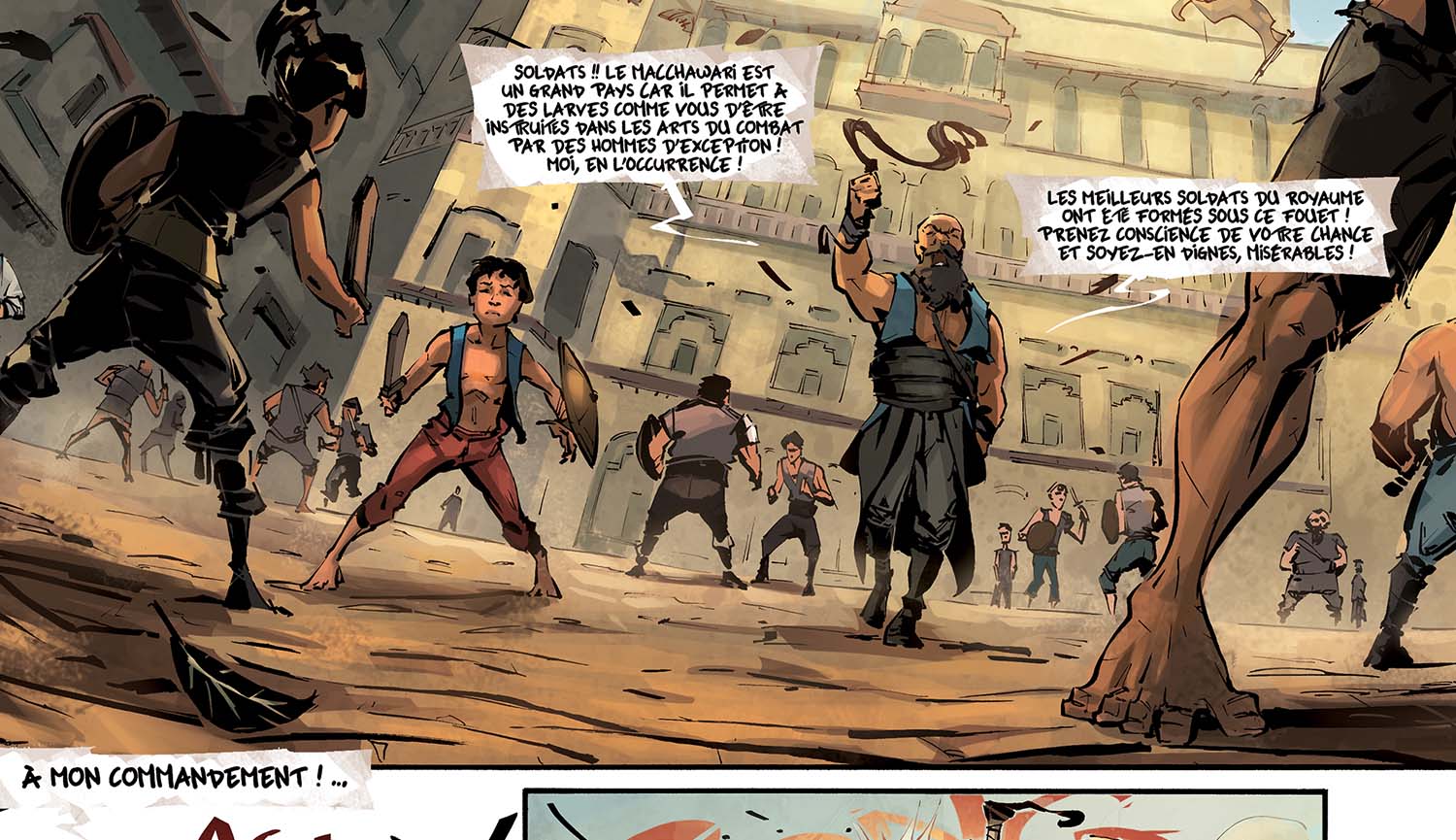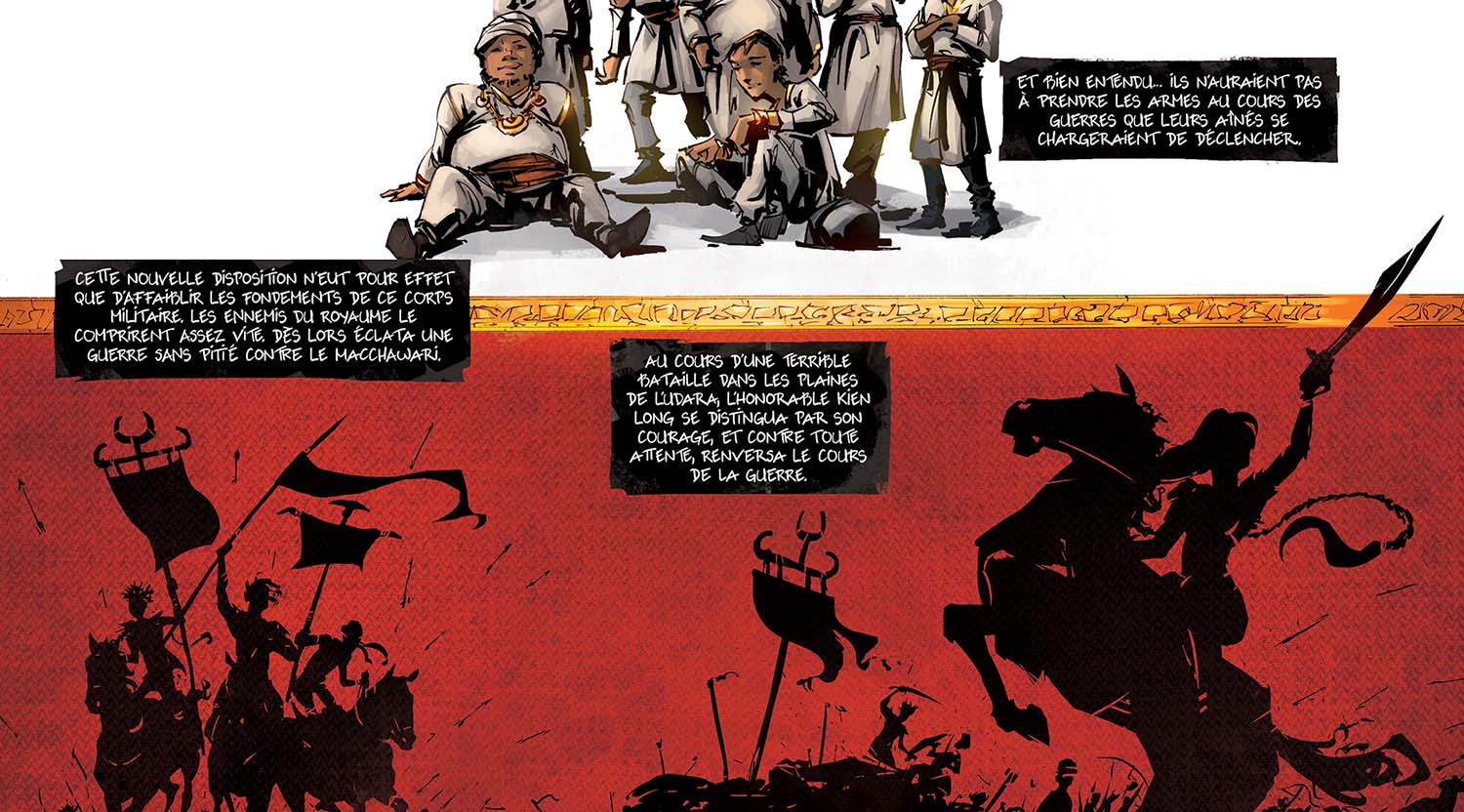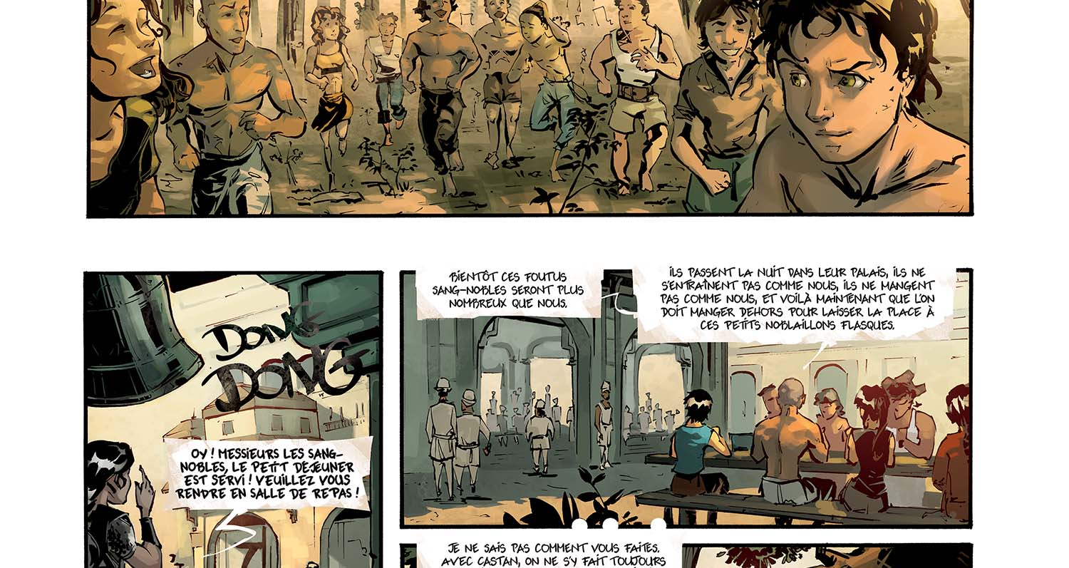 Alors, le souci : y'a clairement trop de textes dans la première partie du chapitre ! Du coup ça casse un peu le rythme de l'histoire, et c'est pas facile à lire. Ok, on a construit tout un univers et on voulait le raconter. En plus, c'est des infos super importantes pour la suite ! Alors, on aurait dû faire quoi ? Deux solutions : soit en dire moins, soit rajouter des pages. Il faut garder à l'esprit cette bonne vieille maxime qui marche bien au cinéma et en BD : "show, don't tell" : Plutôt que de dire ce qui se passe, montre-le.